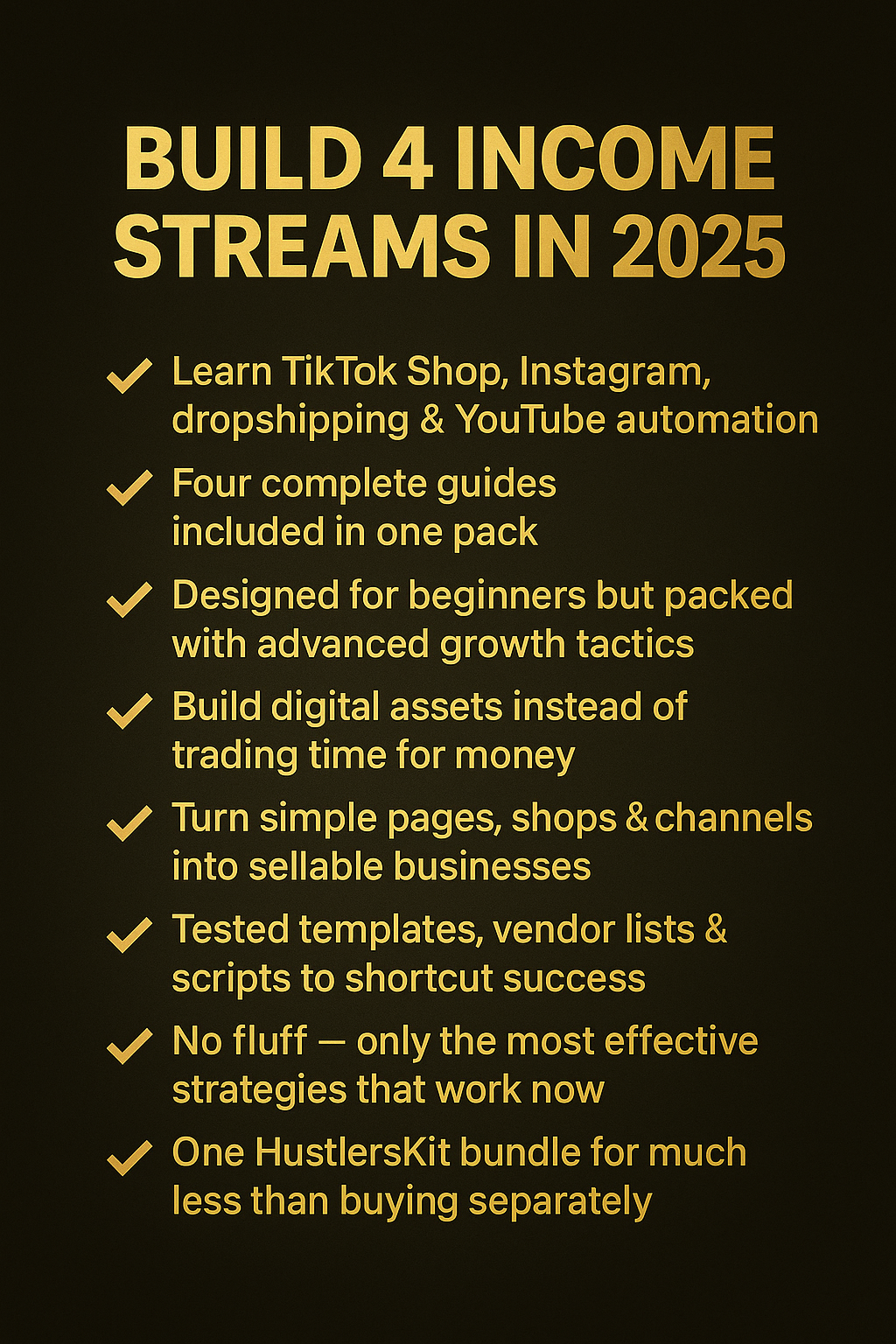 Unlock your potential with our comprehensive guide pack featuring proven methods to monetize your passions through TikTok, Instagram, Dropshipping, and YouTube Automation, empowering you to build multiple income streams in 2025.